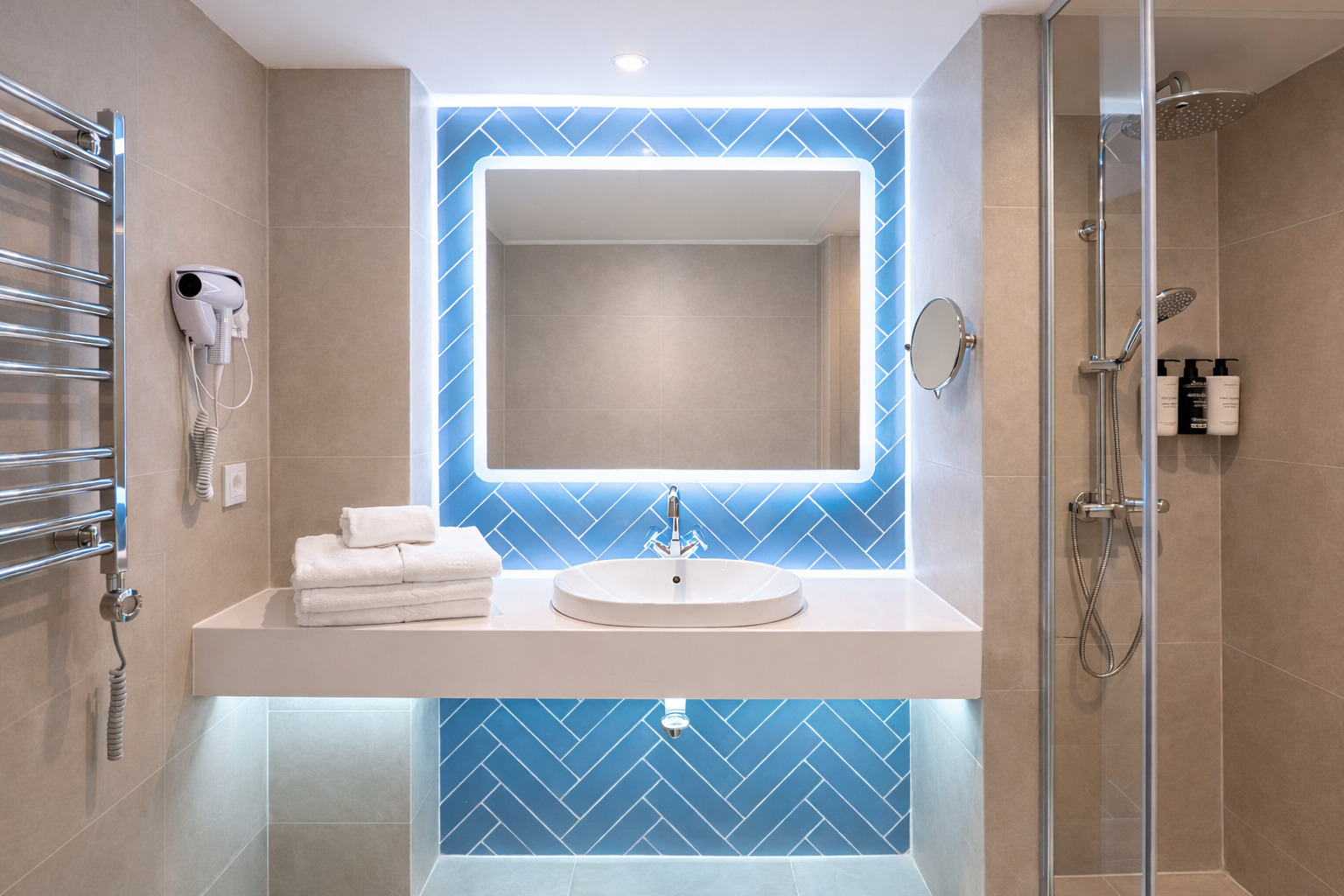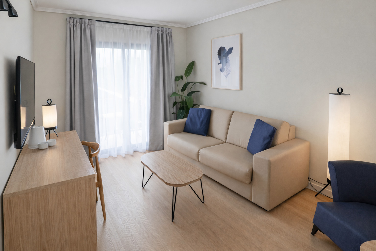 Habitación Junior Suite con vistas piscina y cama king size garantizadas. Balcón o terraza. Saloncito, sofá que se convierte en cama. Baño privado con secador de pelo, calefactor, caja fuerte y minibar. Parking y Wifi gratuitos.